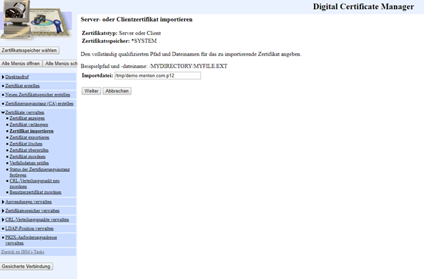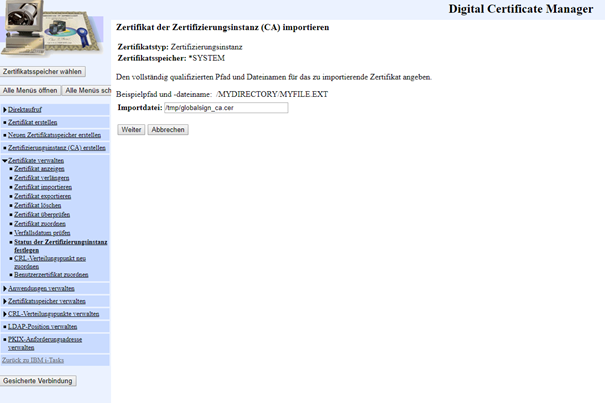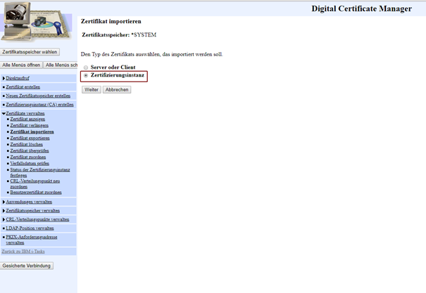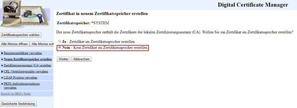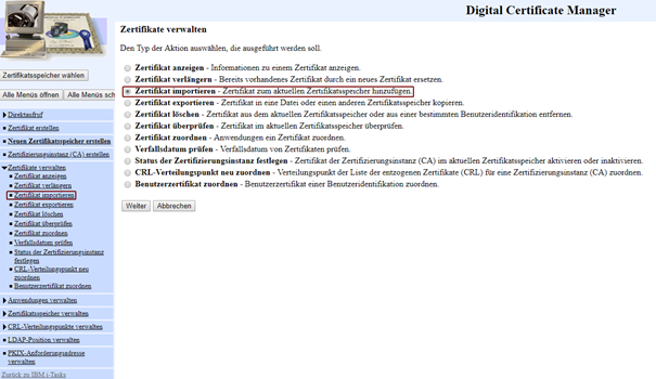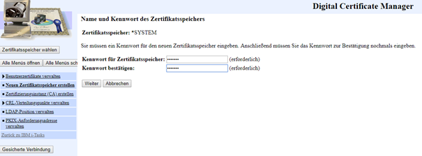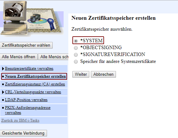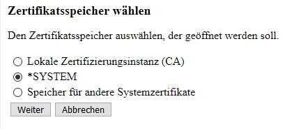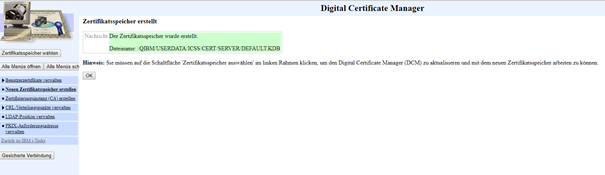 Dazu muss der Digital Certificate Manager installiert werden: 5770SS1, Option 34 (Digital Certificate Manager, Bestandteil des Betriebssystems)