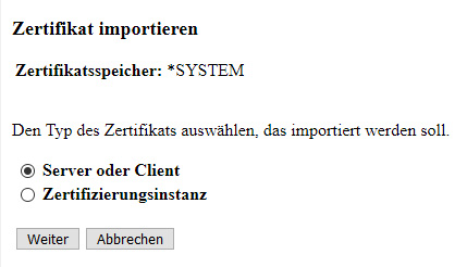 Danach importieren Sie Ihr Zertifikat als Server oder Client Zertifikat. Ist Ihr Zertifikat von anderen Zertifikaten abhänig, müssen sie diese Zertifikate vorher als Zertifizierungsinstanz importieren.