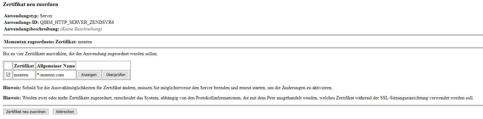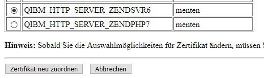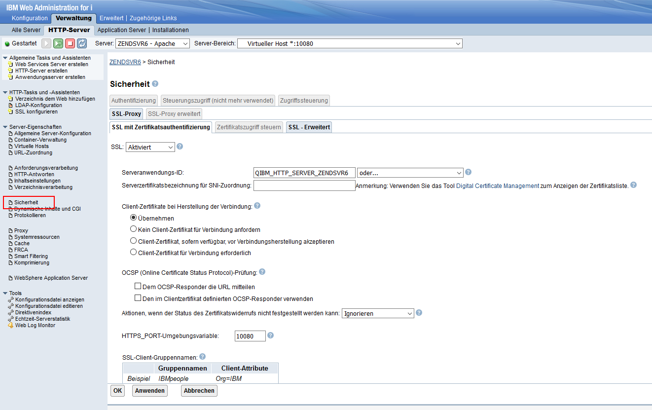 Aktivieren Sie "SSL" im Dropdown und wählen Sie die "Serveranwendungs-ID" aus (QIBM_HTTP_SERVER_ZENDSVR6 oder QIBM_HTTP_SERVER_ZENDPHP7).