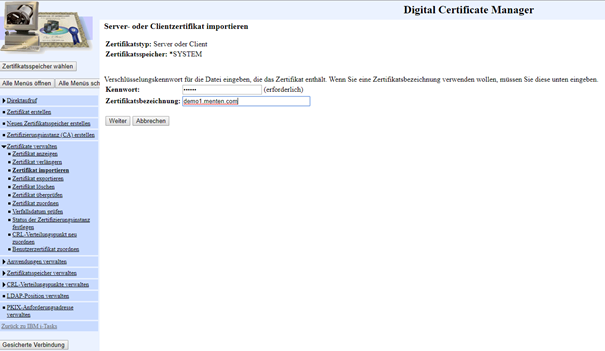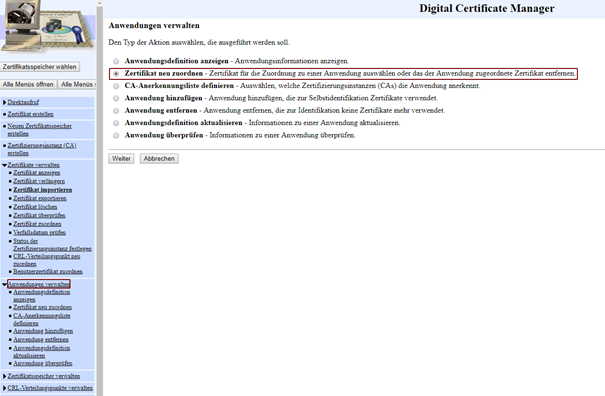 Auf der nächsten Seite öffnen Sie den Link "Digital Certificate Manager: http" und melden sich mit Benutzername und Passwort an.