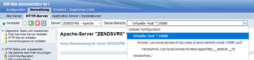 Wählen Sie nun unter Verwaltung -> HTTP-Server die Apache Version für den bei Ihnen installierten ZendServer (ZENDSVR6 - Apache oder ZENDPHP7 - Apache) im ersten Dropdown und dann den Eintrag Virtueller Host *:10080 oder Virtueller Host *:10090 im zweiten Dropdown aus.