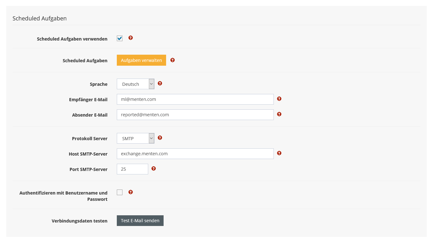 Um die Benachrichtigungs Funktiion nutzen zu können, muss diese über die Auswahl "Scheduled Aufgaben verwenden" aktiviert. werden. Sie müssen dann einen gültigen E-Mail Server, sowie E-Mail Adressen für den automatischen Versand von Benachrichtigungen eintragen. Erst nach den Speichern dieser Einstellungen können die Aufgaben über den Button "Aufgaben verwalten" erstellt und bearbeitet werden.