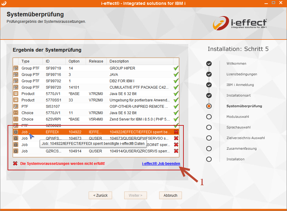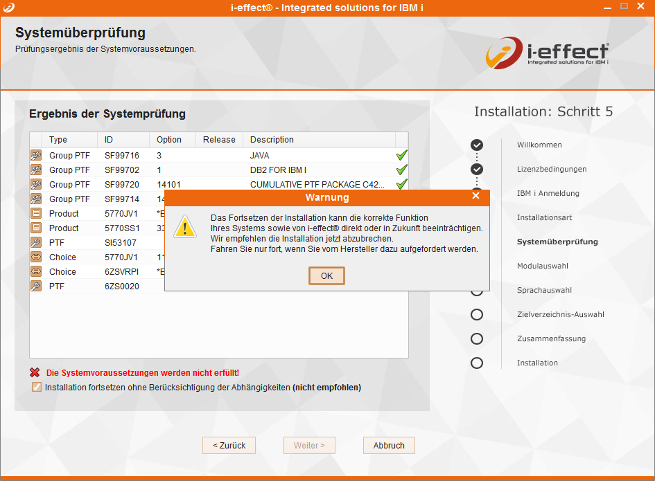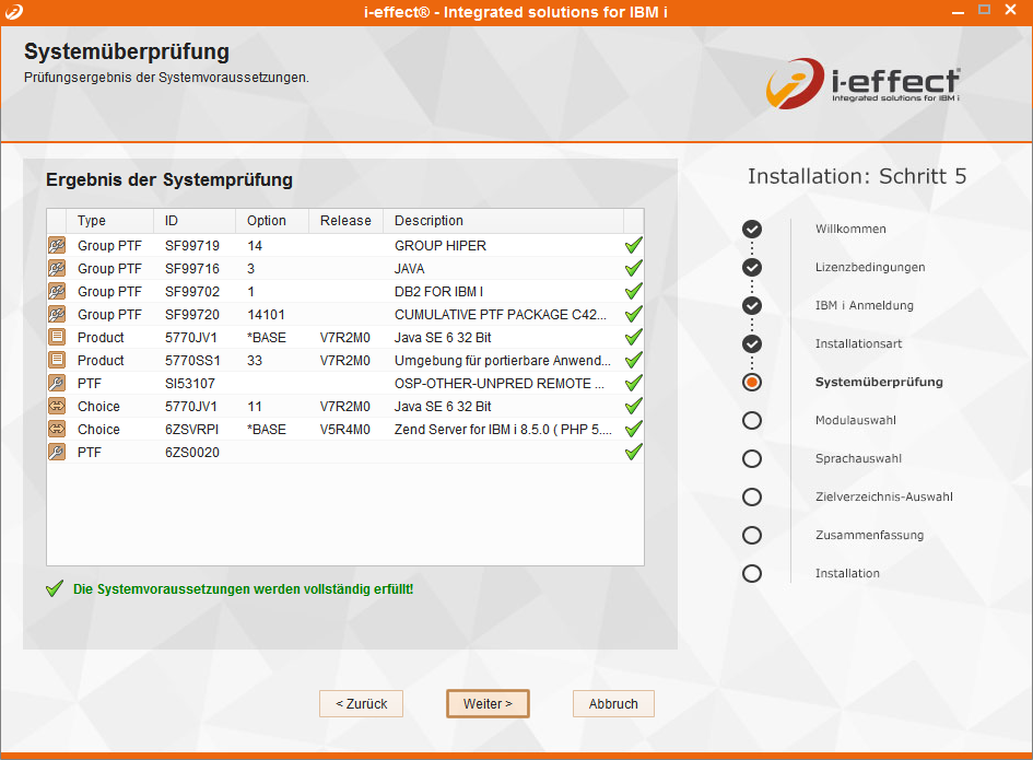 Basierend auf der vorangegangenen Auswahl wird das System überprüft. Da jede i-effect®-Version bestimmte PTF- und PTF-Gruppen-Stände voraussetzt, erfolgt vor dem eigentlichen Beginn der Installation eine Überprüfung der Systemvoraussetzungen.