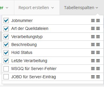 In diesem Fenster werden alle zur Auswahl stehenden Spalten in einer Liste angezeigt und lassen sich durch die Checkbox ein- oder ausblenden. Mit dem Feld am rechten Ende der Einträge können die Spalten durch Klicken und Ziehen mit der linken Maustaste in ihrer Reihenfolge verändert werden.