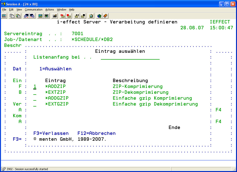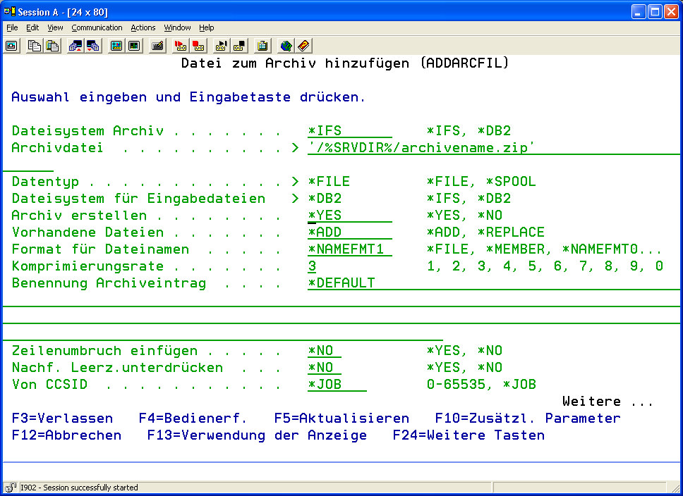 | Beispiel: Komprimierungsart *ADDZIP | Hier können Sie die Komprimierungsparameter der zur Verarbeitung ausgewählten Dateien definieren. Parameterbeschreibung siehe Kapitel 6 „Komprimierung", Menüpunkt 3 (ADDARCFIL)