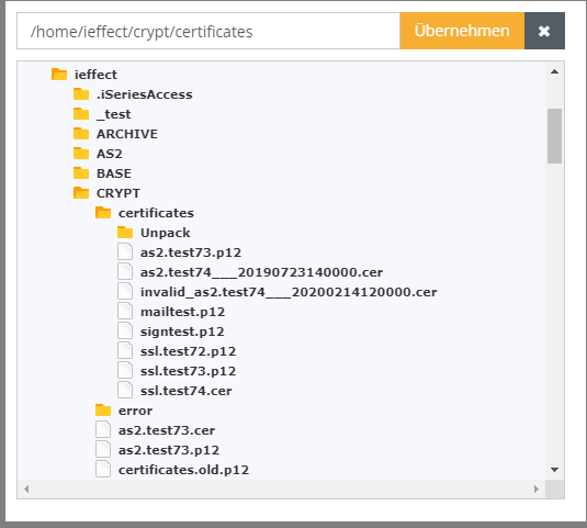 Ab Version 2.8 können Zertifikate und Schlüsselpaare anstatt in einer Keystoredatei auch in einem IFS-Verzeichnis abgelegt und verwendet werdeen.