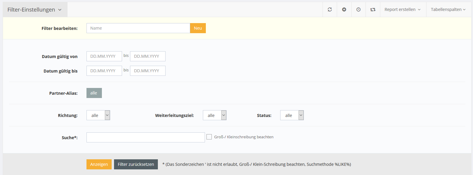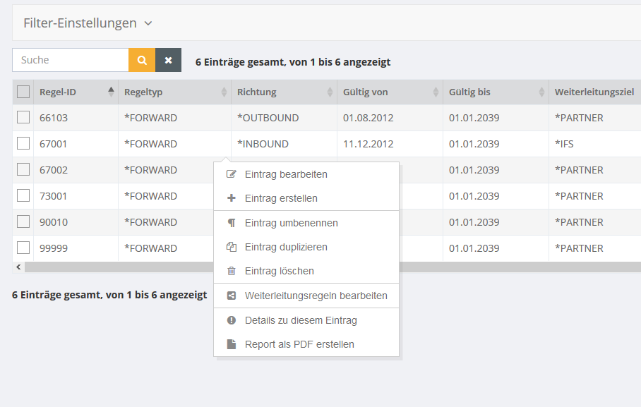 In den Filtereinstellungen kann neben dem Suchfeld, Datum und Zeit, Partner Alias, Richtung, Weiterleitungsziel und Status gefiltert werden.
