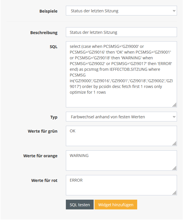 Dieses Widget zeigt Wert mit Beschreibung aus einem frei definierbarem SQL an. Die Hintergundfarbe ändert sich wie eine Ampel anhand von Schwellenwerten.
