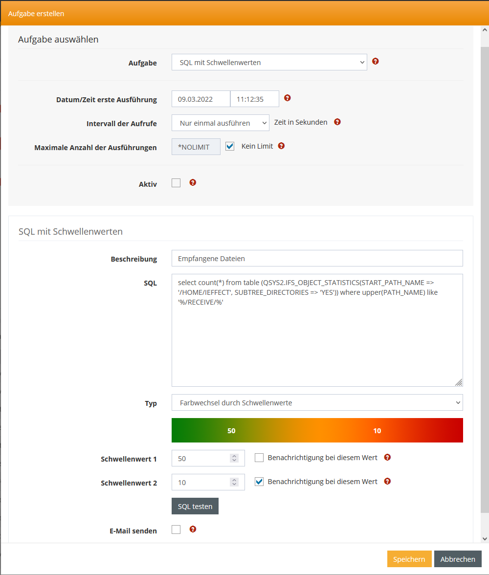 Bei der Auswahl von Schwellenwerten wird die Ampel grün oder rot, wenn der dafür definierte Schwellenwert je nach gesetzter Bedingung unter- oder überschritten wird. Alles was zwischen den Schwellenwerten liegt, ergibt eine orange farbene Ampel.