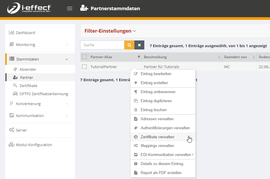 Öffnen Sie unter Stammdaten das Menü Partner. Wählen Sie im Kontextmenü Zertifikate verwalten, um in das Menü zu gelangen, in welchem Sie den privaten Schlüssel hinterlegen können.