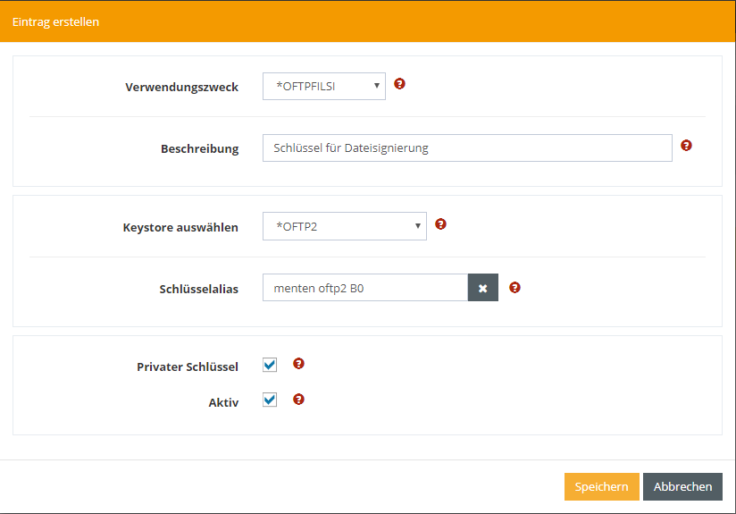 Nun müssen Sie Angaben zum privaten Schlüssel machen. Geben Sie den Namen im Keystore als Schlüsselalias an und wählen den Verwendungszweck *OFTPFILSI (Dateisignierung). Den Keystore können Sie mit Pfad und Passwort angeben oder den Standardwert *OFTP2 verwenden. Setzen Sie die beiden Auswahlen, da es sich um einen Schlüssel handelt und dieser sofort verwendet werden soll.