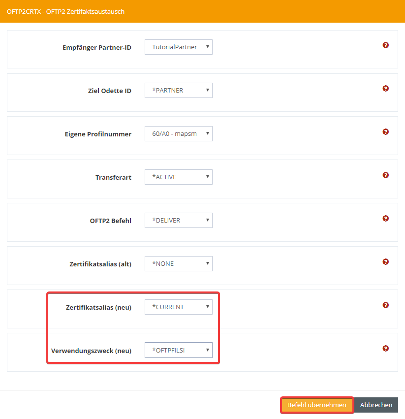Im nächsten Fenster wählen Sie den Partner, an den das Zertifikat gesendet werden soll, und das eigene Profil, welches für die Kommunikation benötigt wird. Die Transferart *ACTIVE veranlasst direkt einen Verbindungsaufbau. Mit dem OFTP2 Befehl *DELIVER wird das Zertifikat einfach übertragen. Den optionalen Parameter für den alten Zertifikatsalias setzen Sie auf *NONE, weil es kein vorheriges Zertifikat gibt. Für das neue Zertifikat wählen Sie das aktuell (*CURRENT) eingerichtete Zertifikat für die Dateisignierung *OFTPFILSI. Bestätigen Sie anschließend mit Befehl übernehmen.