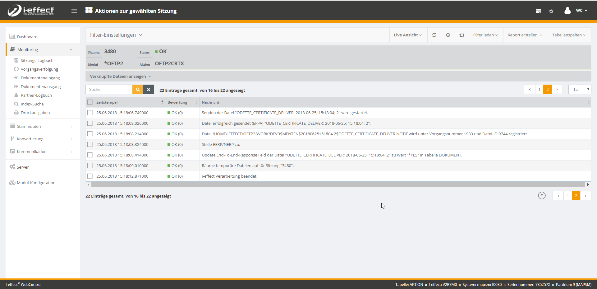 Sie können den Befehl nun Ausführen. Für den Befehl wird eine neue Sitzung erzeugt, derren Status Sie im Sitzungs-Logbuch nachschauen können.