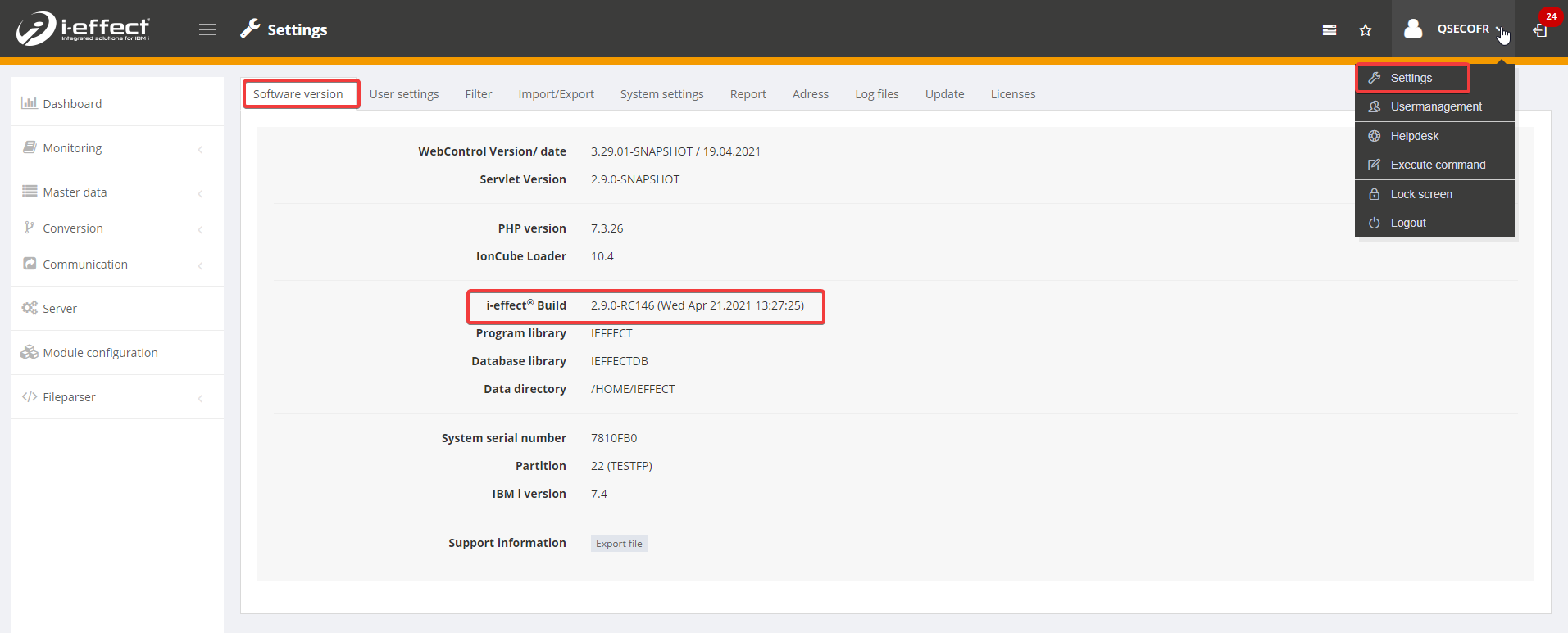 After opening the graphical user interface of i-effect, the currently used version is displayed in the settings below the tab Software version