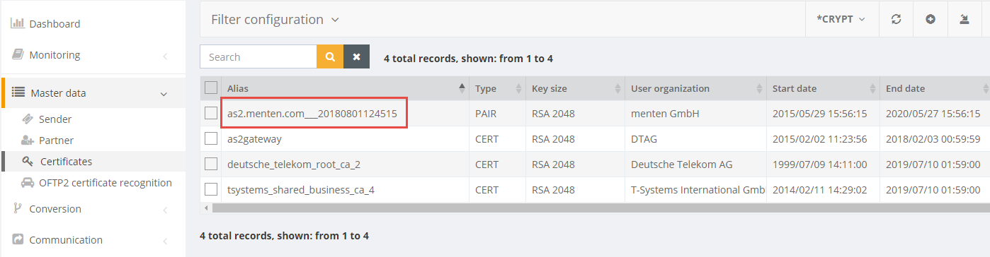There are three entries with alias or base name 'as2.menten.com' in the keystore, the alias without timestamp is always loaded and used.