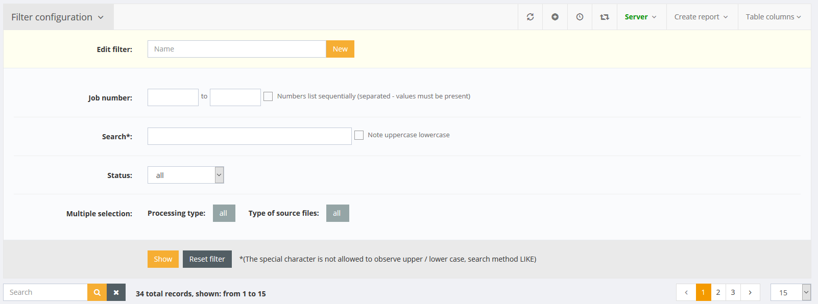 In filter settings the user can filter for search field, the status, the type of source files and converting type.