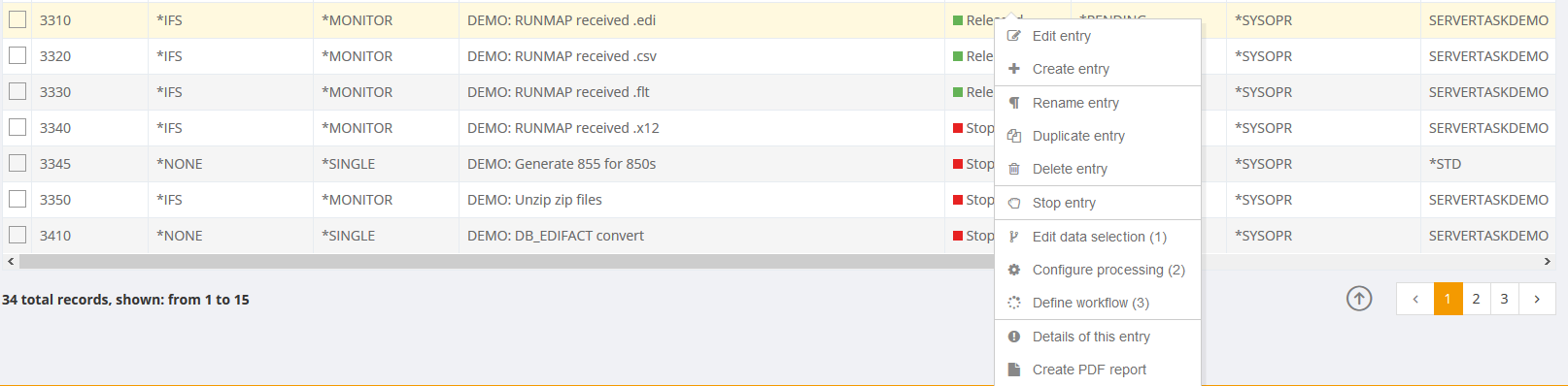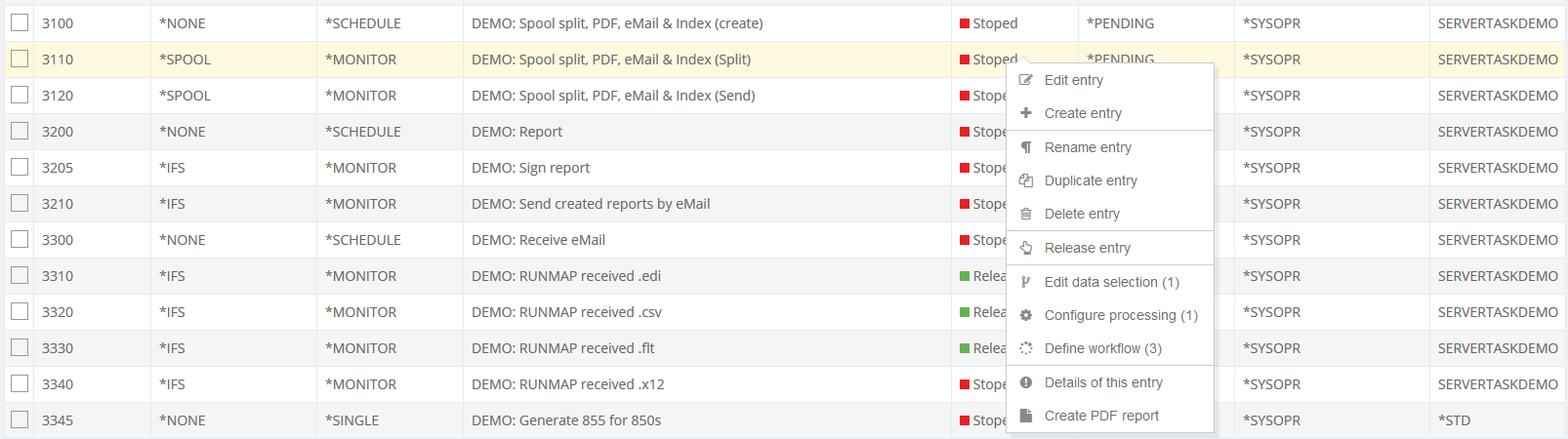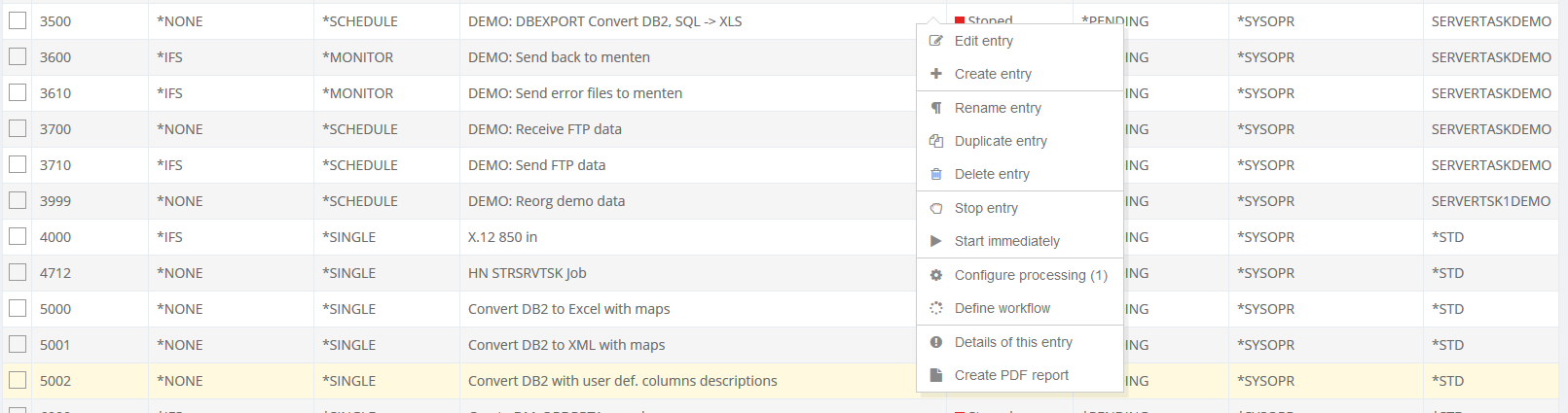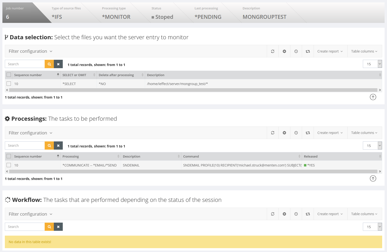 The workflow associated with the server entry. When an entry is generated processing and configuration type are respectively selected. The resulting i-effect® command is registered via the command-mask.