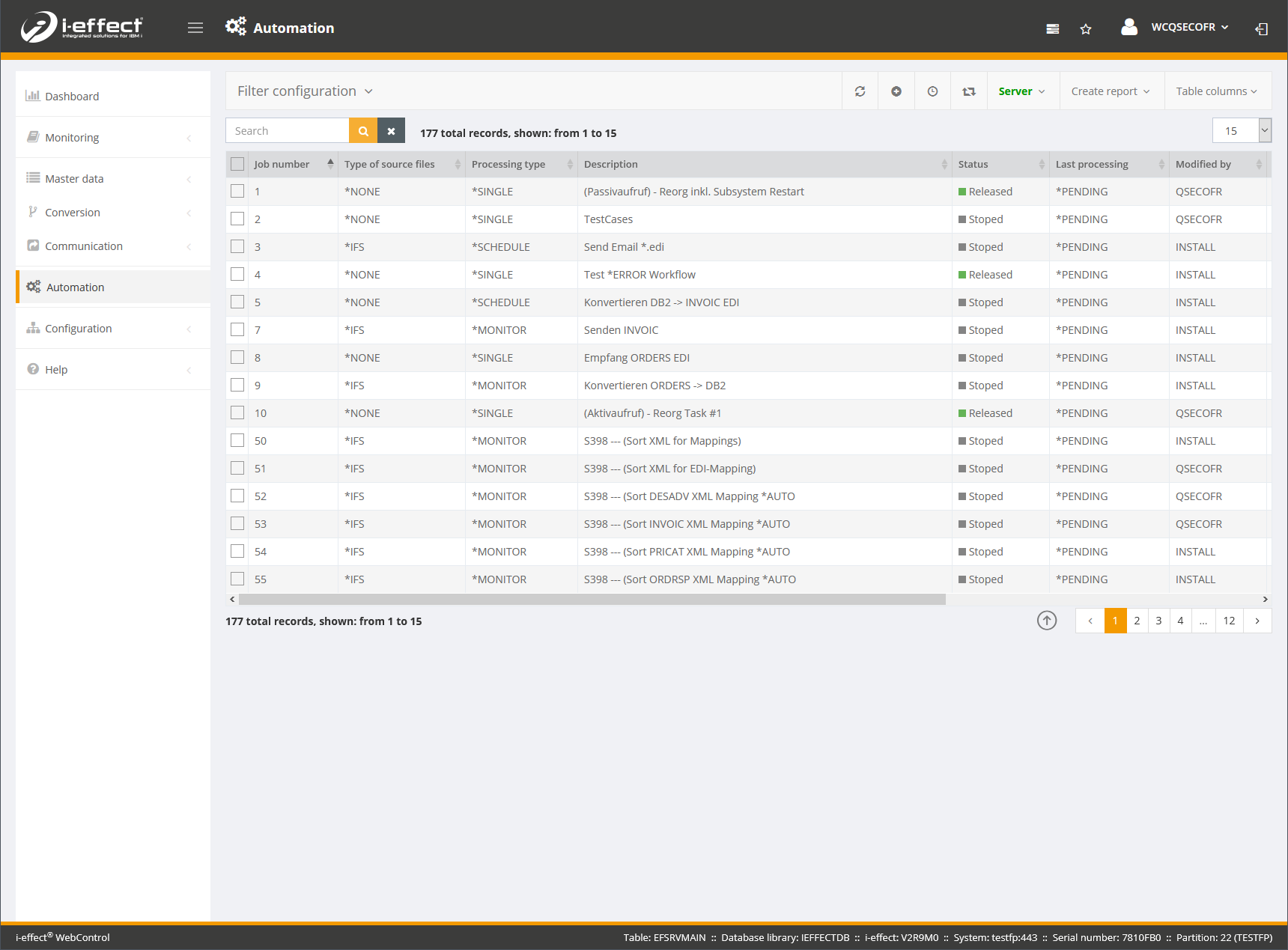 In addition to creating and editing entries, there is a function in the Automation section that determines the current server status and can be used to start or stop the i-effect® Server.