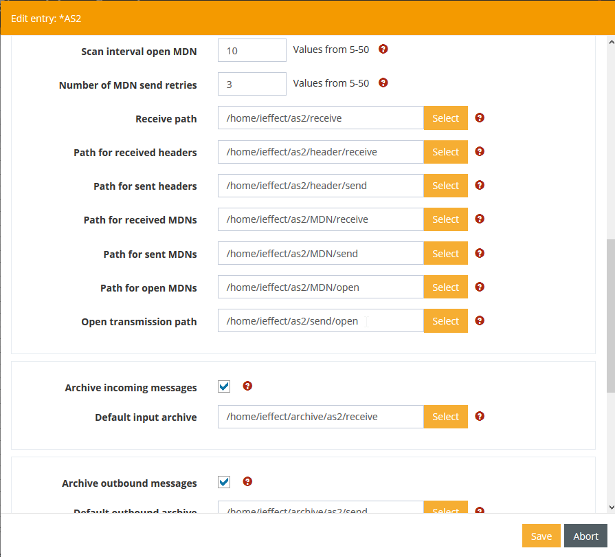 Temporary working directory for storing received AS2 messages with asynchronous MDN (Message Disposition Notification) request. This means that AS2 messages with an asynchronous MDN request, after they may have been decrypted and verified, are stored in this directory as an AS2 file until the asynchronously requested MDN is successfully returned to the sender of the AS2 message. When the asynchronously requested MDN has been successfully returned to the sender of the AS2 message, the files associated with the received AS2 message (file attachment, message header file, and MDN file) are stored in the associated directories. If the return of the asynchronously requested MDN fails, all the above files will be stored in /i-effect//as2/error.