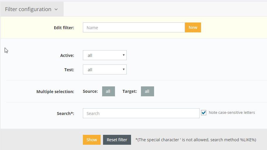In the filter settings you can filter by source and target module as well as by the status Active and Test.