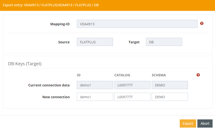 If database connections are used in mapping, they can be adjusted during export. This is usually the case if mappings are exported that are to be used on other systems where the names of the catalogs and schemas used are different. This information can be overwritten in the corresponding input fields.