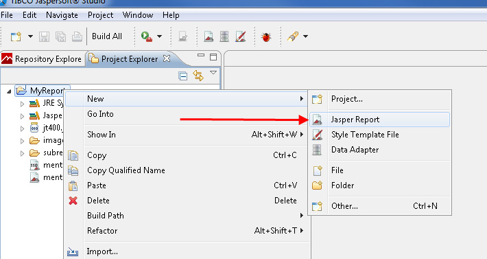 Change to the „Project Explorer" and choose „new=> Jasper Report" via right clicking the „MyReports" project.
