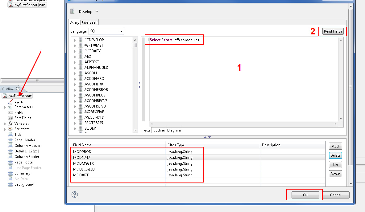 Enter the SQL statement in the window for (1) and click on "Read Fields"(2).