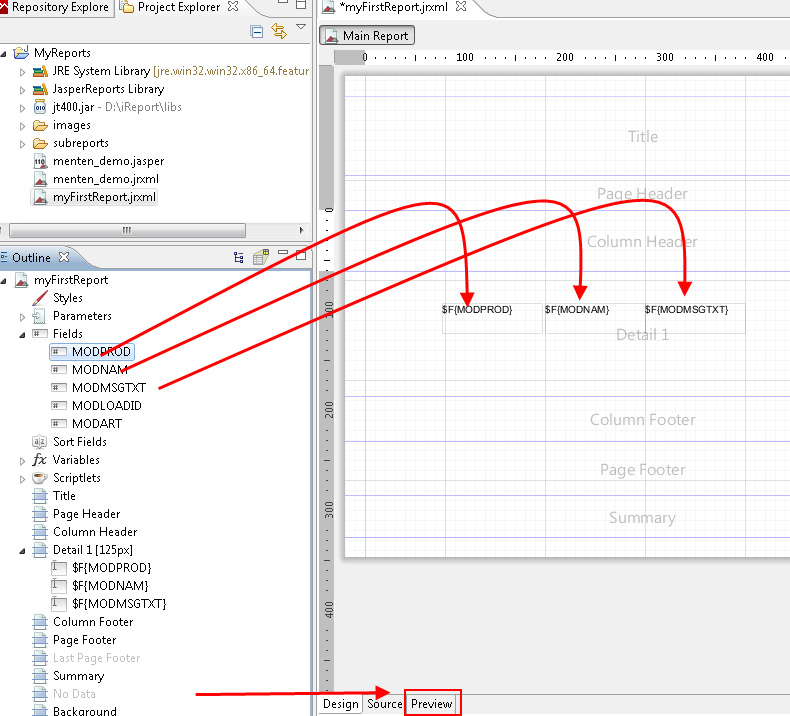 Via drag and drop of the sections, position the elements in the detail area of the report. Here, three sections from the query were positioned side by side in the report to result in a table-like list of the files. Decrease now the height of the detail area on the necessary minimum via clicking twice on the bottom line. Add a static text for the headline. Now you can click "Preview" to look at the final report.