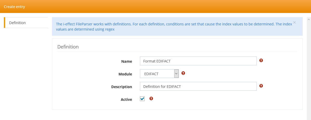 If the MAPPER module is selected when creating a definition, only index values can be defined for this module and the entry has no Active status. The index values defined for the MAPPER module are only used for display in the logbook.