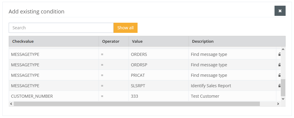 These are transferred to the list of assigned conditions by mouse click. If such a condition has a lock symbol, it belongs to the standard definitions delivered with the program and cannot be edited. Only the link type, the level and the active status can be assigned by clicking on the entry in the upper list.
