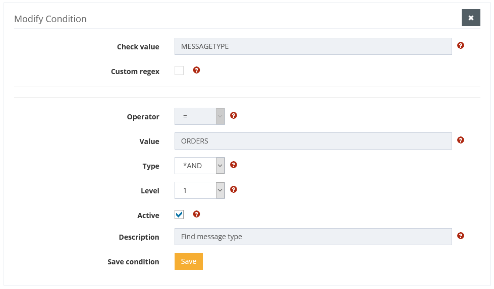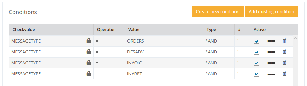 In the upper list entries can be switched directly to active or inactive and the position of the entries can be moved via the marker on the right side by drag-and-drop. The Delete icon on the far right removes the condition from the current definition, but does not delete it.