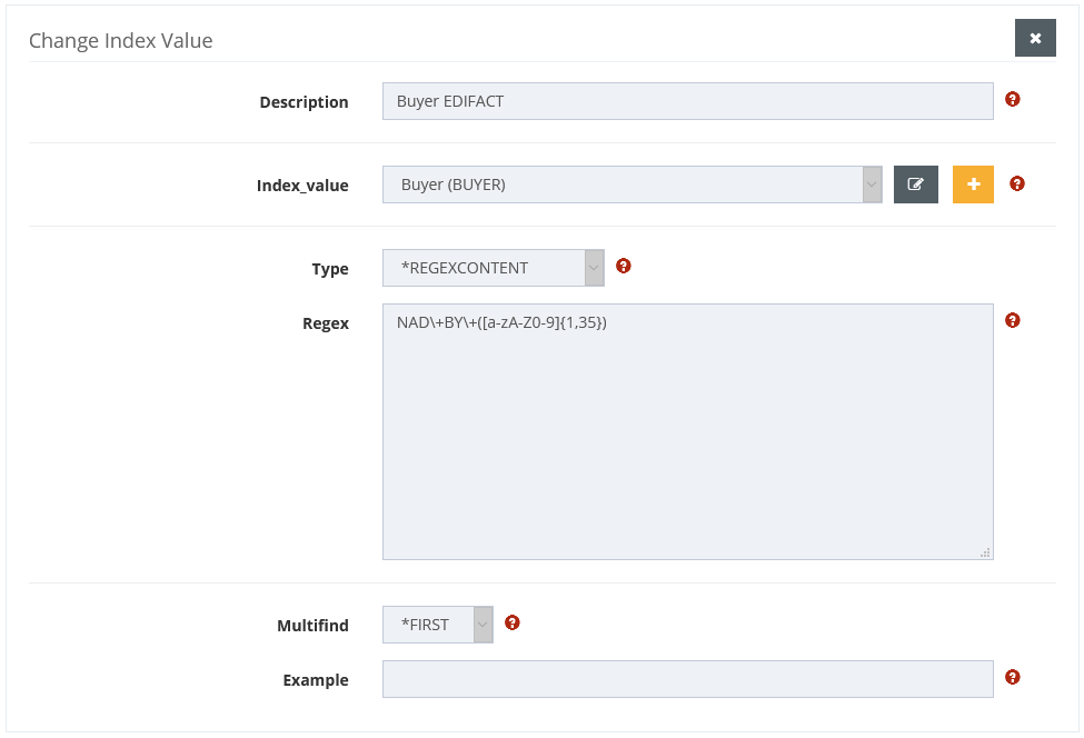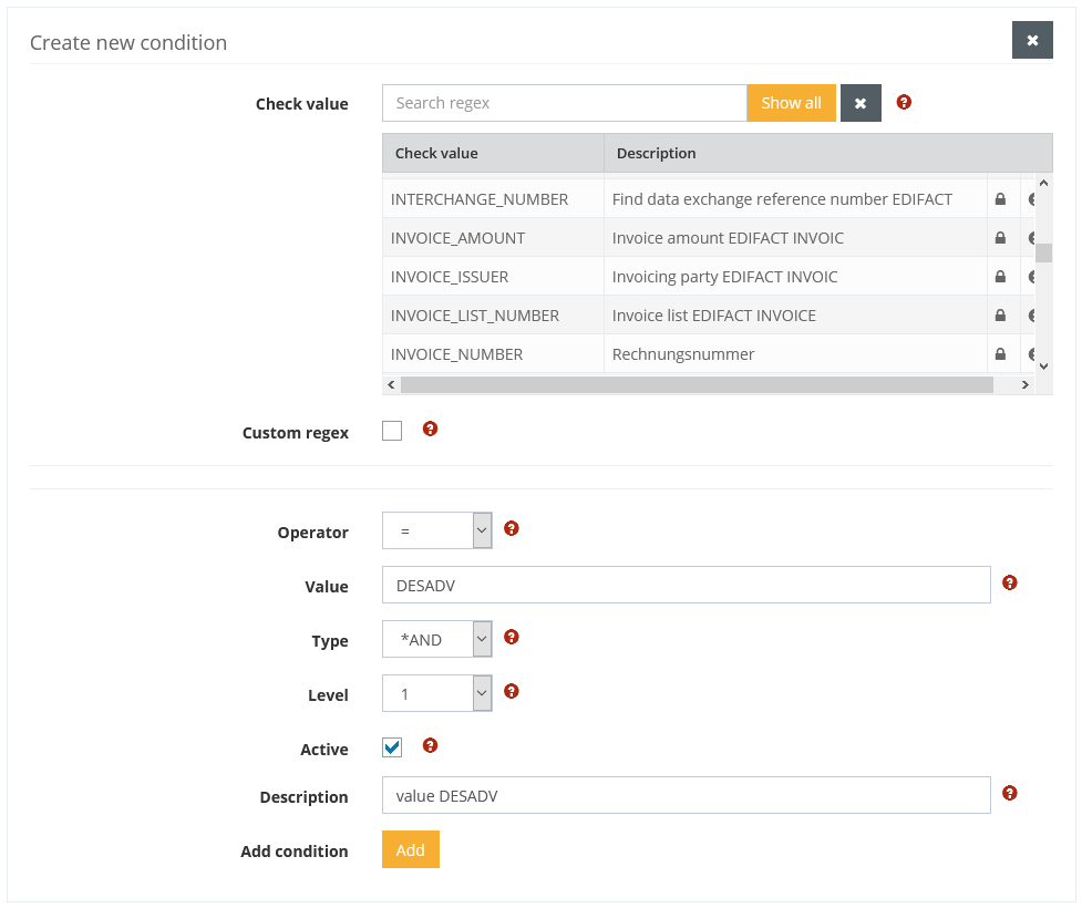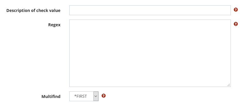 Either a check value can be selected from the existing index values, or a new check value can be created for this condition only by specifying the name and a regex. For a new regex, the Multifind value must then be used to specify whether the first or last occurrence is to be determined.
