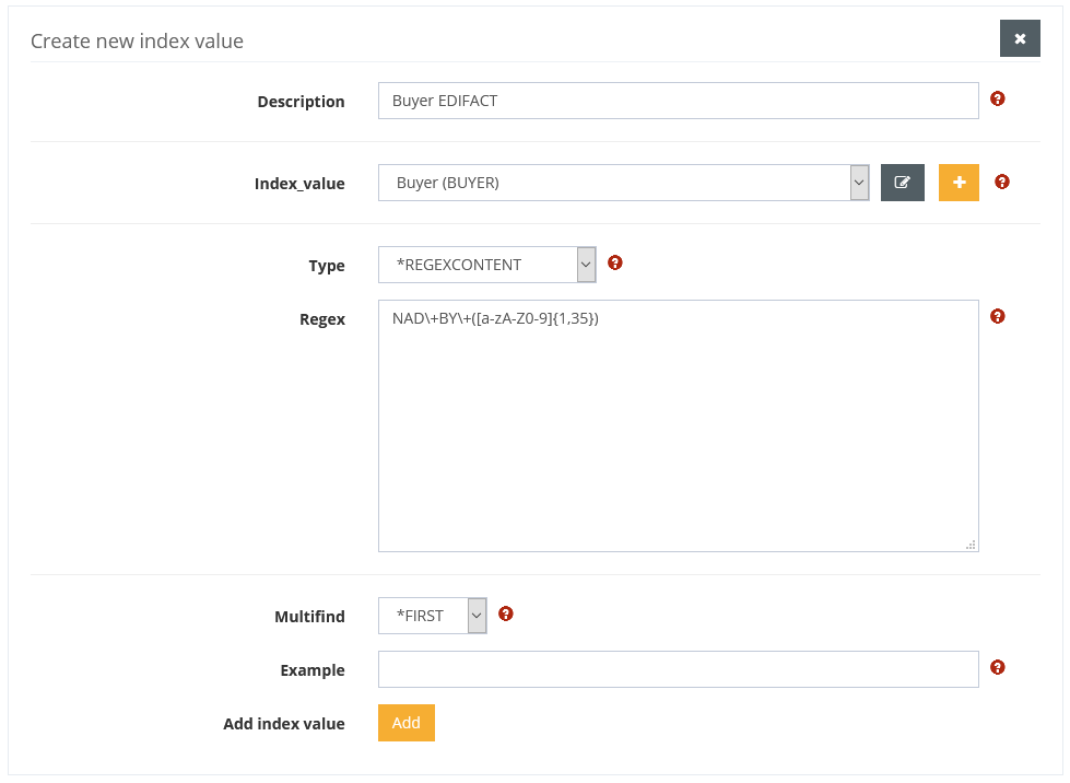 An index value can be selected from the existing values or a new index value can be created via the + symbol. Via the edit symbol next to the index value, the displayed names of the index value can be edited in German and English. Under these names the value is shown in the document input and output. Furthermore, a regex must be entered to find the value. The Multifind value is used to specify whether the first or the last occurrence is to be determined.