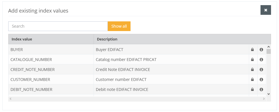 These are transferred to the list of assigned index values by mouse click. If such an index value has a lock symbol, it belongs to the standard index values supplied and cannot be edited.