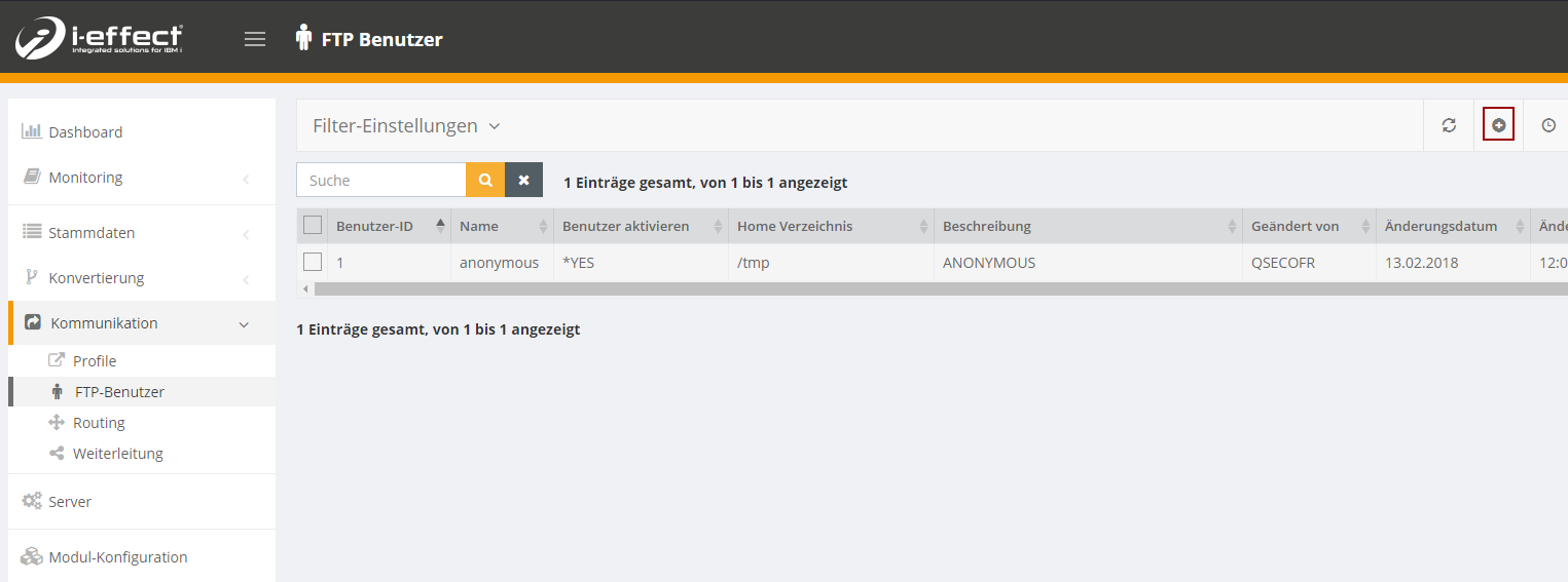 To do this, navigate to the menu item Communication → FTP user and click Create new entry.
