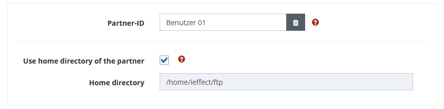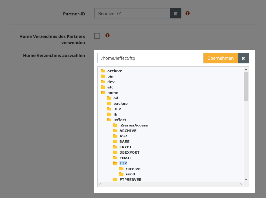 If you have assigned a partner profile to the FTP user whose "Receive path attachment" is not set to *DEFAULT, you can use the home directory of the partner via checkbox.