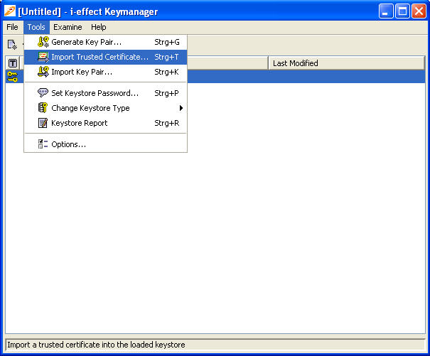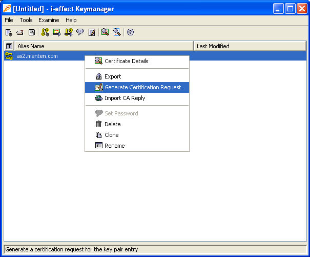- Move the mouse pointer to the entry of the key pair and right-click. In the displayed context menu select menu item "Generate Certification Request".