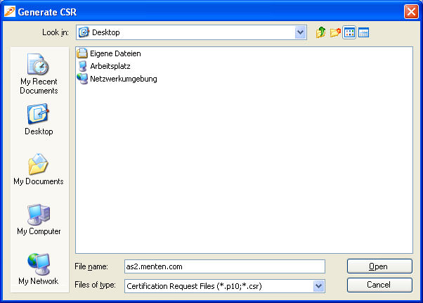 - Select a folder and type in the title of the certificate request. Please note: One of the two file extensions (*.p10 ; *.csr), which are proposed under file type, must be added. Corfirm with "Generate".To have your certificate signed by a Certificate Authority, the generated certificate request file must be transmitted to a Certificate Authority. After successful validation, the Certificate Authority will send back a signed certificate, which has to be reimported into the keystore.