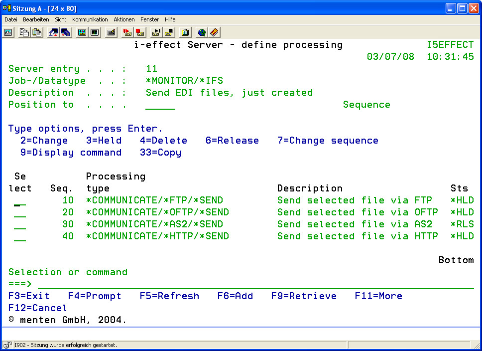 *SERVER's working directory %SRVDIR% is provided at the start of a server job to allow post-processing of data, which has been created in the processing steps. Files that are stored here can be used as source files for further server processing steps, e.g. for distribution. The directory is specified in the default settings of the *SERVER module under menu item 80 of the i-effect start menu.