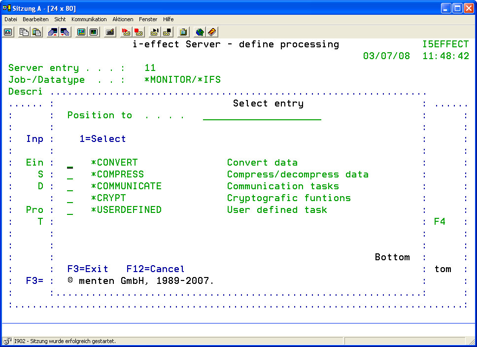 *SERVER's working directory %SRVDIR% is provided at the start of a server job to allow post-processing of data, which has been created in the processing steps. Files that are stored here can be used as source files for further server processing steps, e.g. for distribution. The directory is specified in the default settings of the *SERVER module under menu item 80 of the i-effect start menu.