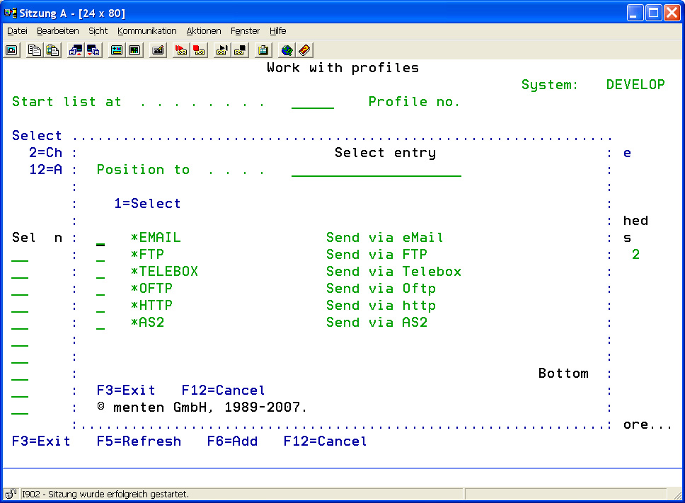 Use option F6 (function key F6) to add a communication profile. In the appearing program interface, possible communication profiles of the installed i-effect modules are displayed and can be selected.
