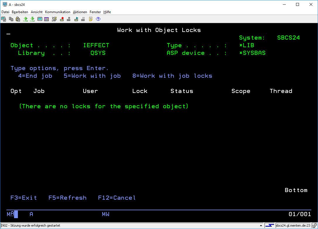 Please note that you must have exclusive authority to the i-effect® application and system libraries during the entire installation process. To check if there are any active locks on the mentioned objects, please use the following commands.