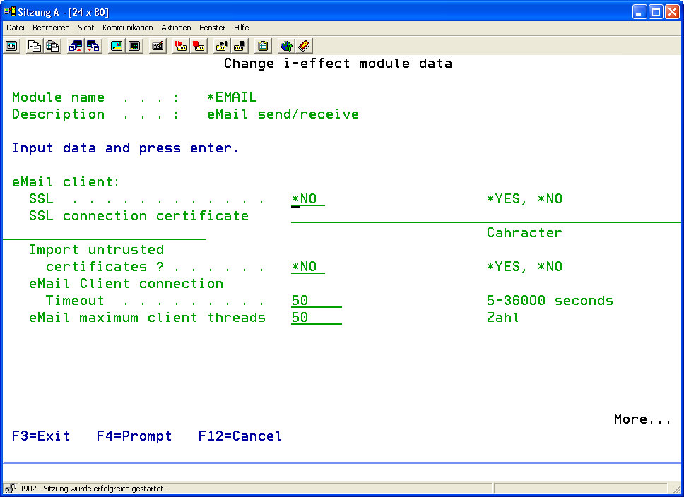 | Import Untrustworthy Certificates ? | Enter the value *YES into this parameter to automatically import email server certificates. The email server identifies to the client by transmitting its X509 certificate itself when the connection is established. If the certificate does not exist in the i-effect® keystore, it will be imported automatically. If the value *NO is entered into this parameter and the certificate of the remote server does not exist in the i-effect® keystore, the connection will automatically be closed | |||||||||||||||||||||||||||