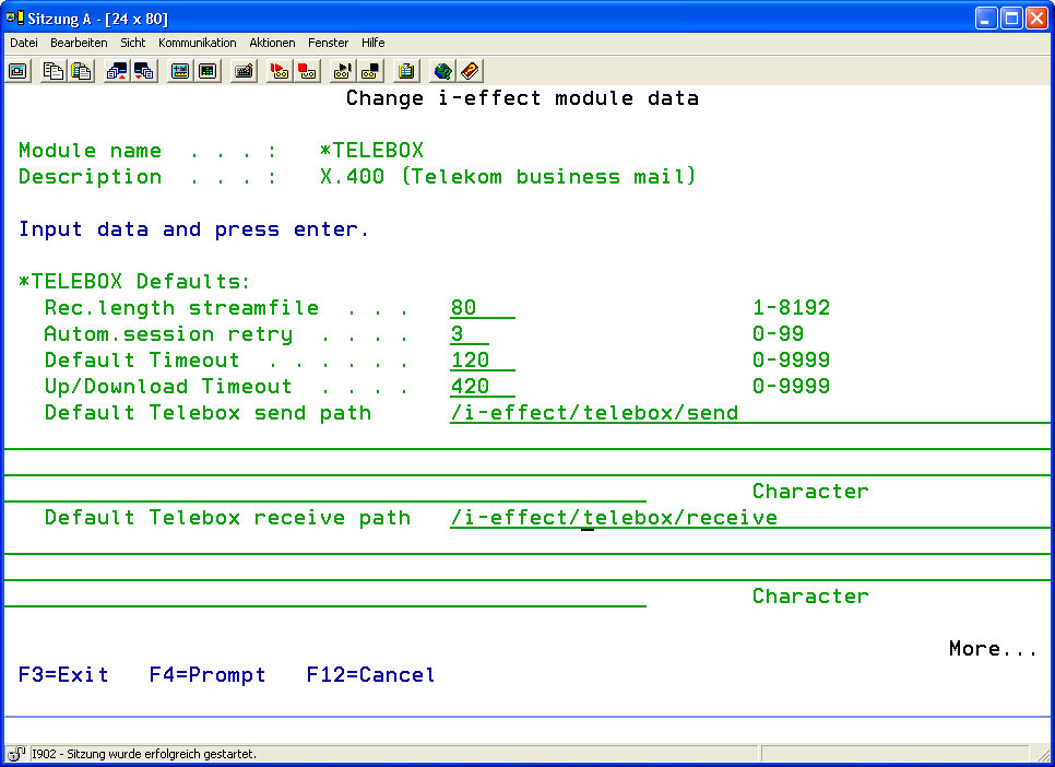 Select the *TELEBOX module by entering option number 8 into the corresponding choice box. In the dialog program „Change i-effect Module Data", parameters can now be modified.