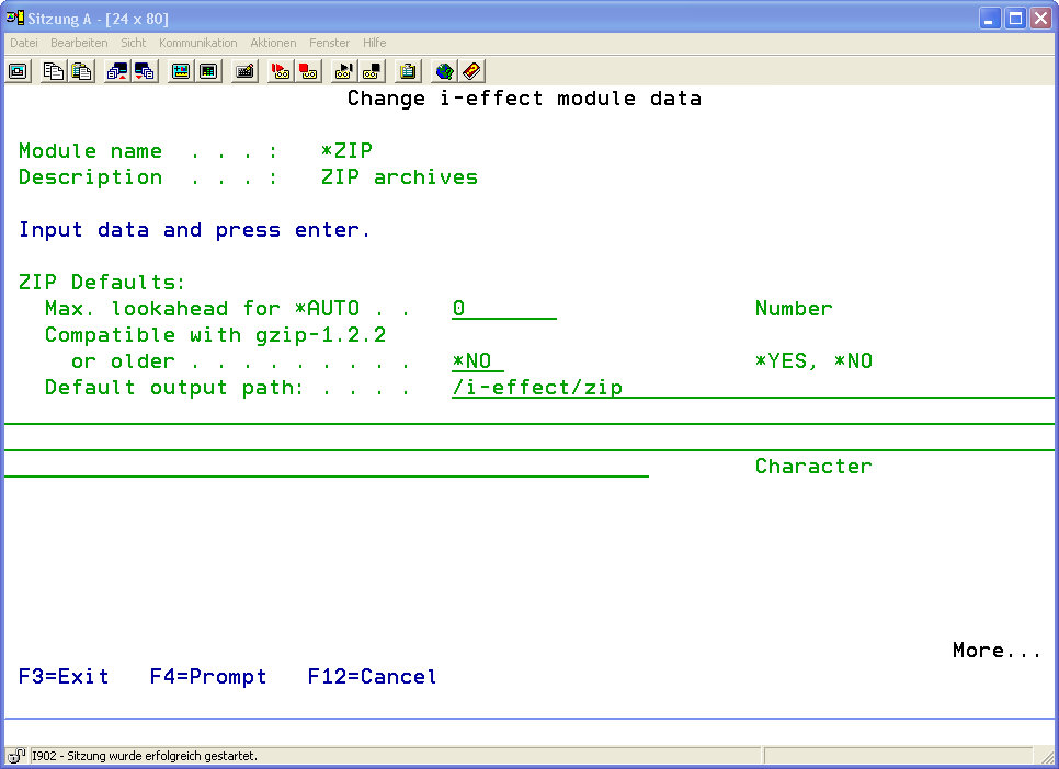 Select the *ZIP module by entering option number 8 into the corresponding choice box. In the dialog program "Change i-effect Module Data", parameters can now be modified.