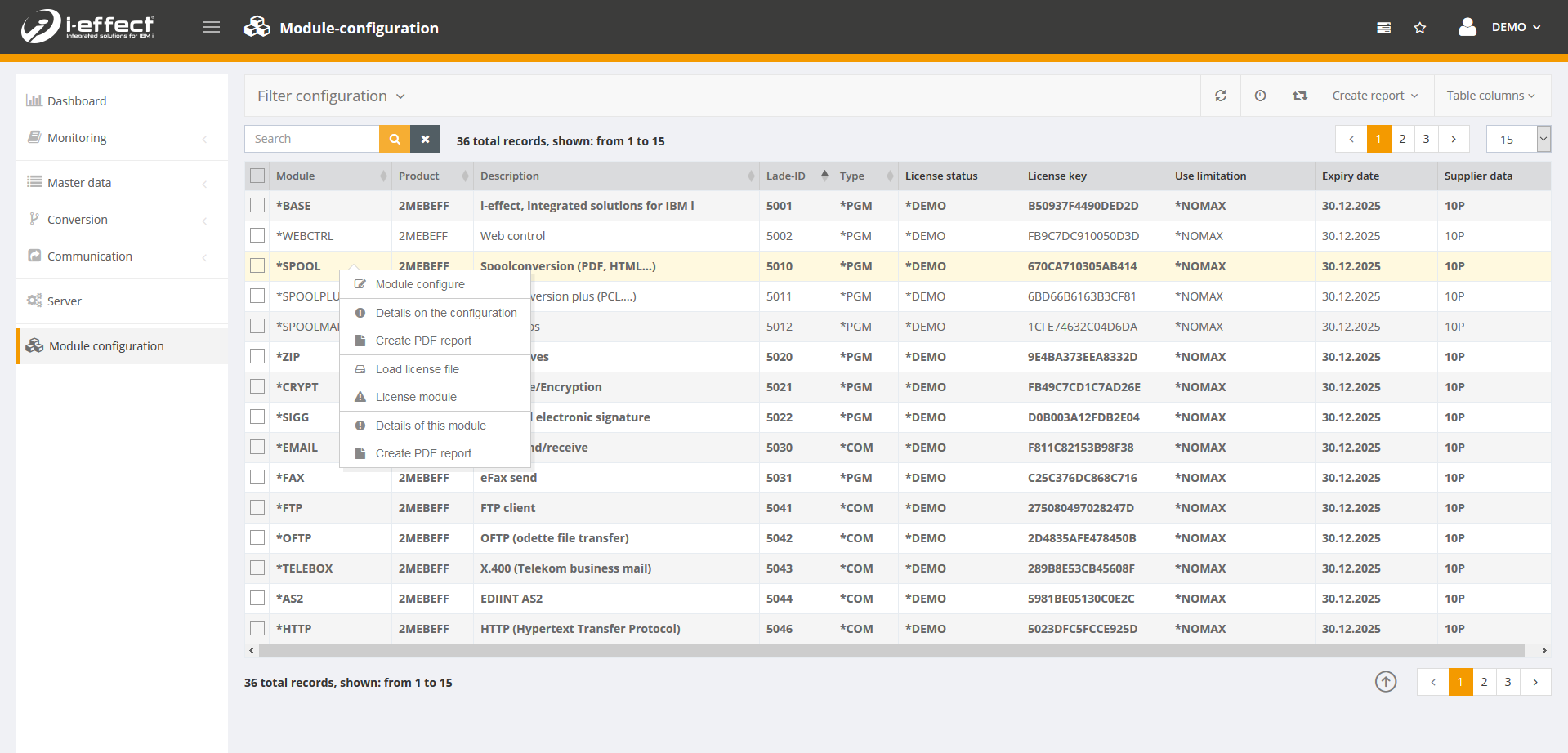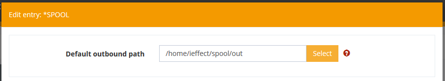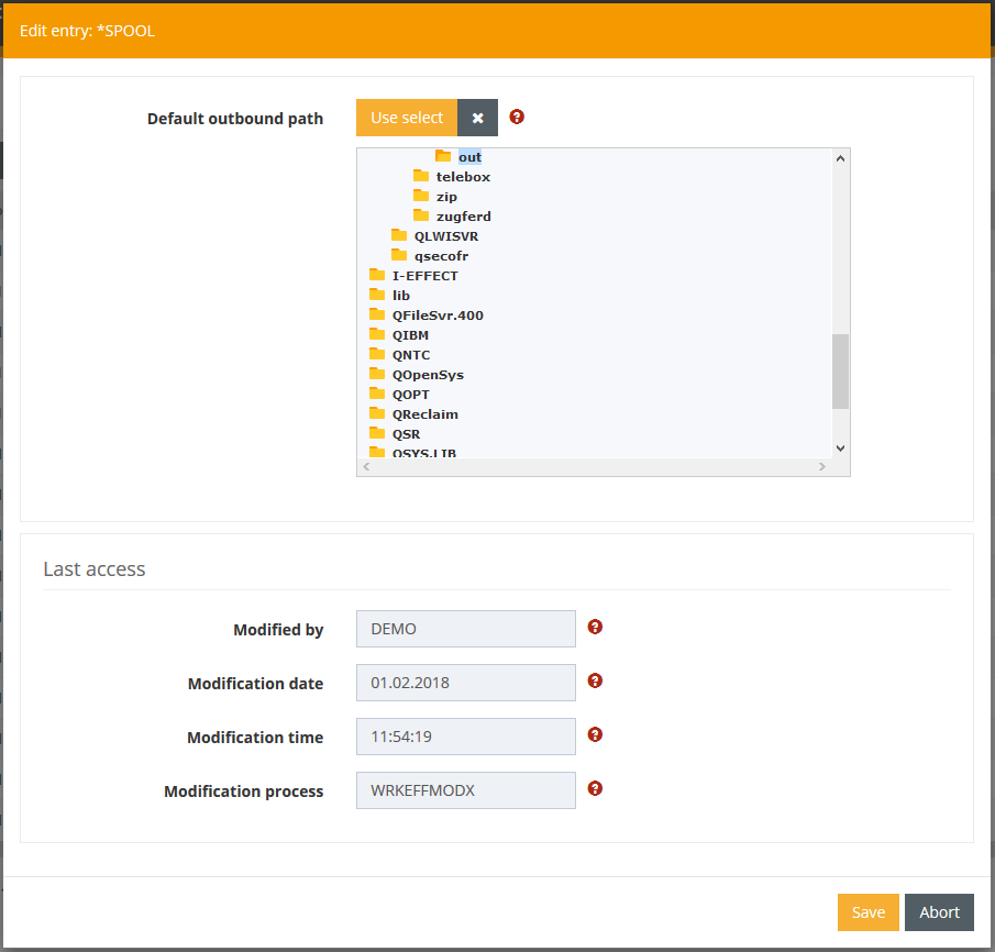 When entering the module master data, you must specify folders and files, and other things. For this purpose, there is a function that displays the directories and files of the system. For example, in the menu item module configuration, you can configure the module by right-clicking on one of the modules, such as on *SPOOL. A file selection must then be selected in the field default outbound path.