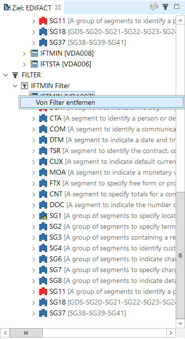 Right clicking on an element directly under the filter opens a context menu from which Remove from Filter can be selected. Selecting this menu item deletes the element from the filter.