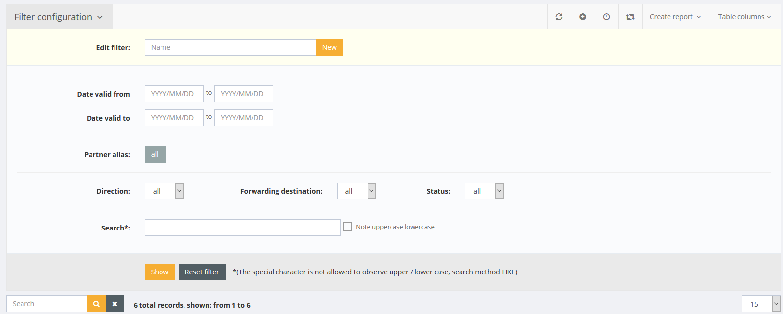 In filter settings search field, date and time, partner alias, direction, transfer destination and status can be filtered.