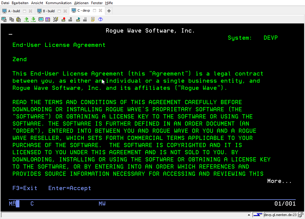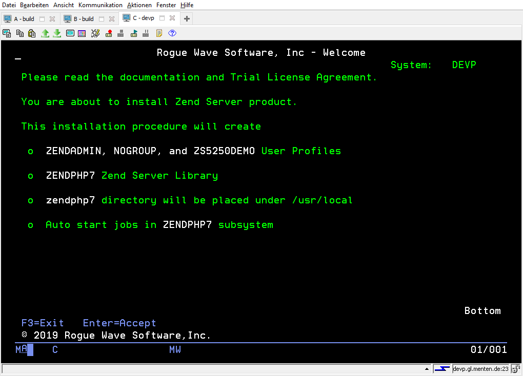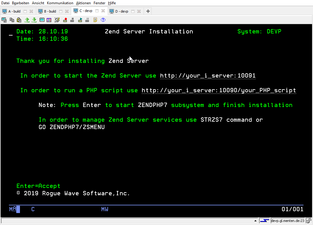 Now the ZendServer must be restarted: In the green screen call "go zendphp7/zsmenu" and quit the ZendServer with selection 11. Then restart with selection 1.