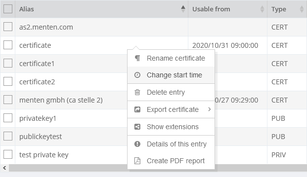 For each certificate, a start time can be defined from which the certificate is used. With this function, several certificates with the same alias name can exist in the keystore. The start time then determines the time from which one certificate replaces the other. The start time can also be subsequently adjusted via the context menu.